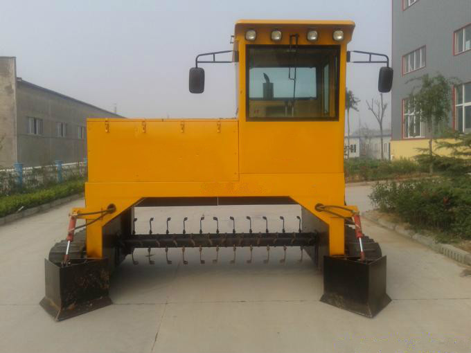 自行走式翻堆機采取四輪行走設計,可前進、倒退、轉彎,由一人操控駕駛。行駛中整車騎跨予先堆置長條形肥機上,由機器下掛裝的旋轉刀 ,對肥機原料實施翻拌、蓬松、移堆,車過之后形成新的條形堆垛,即可在開闊場地,也可在車間大棚實施作業。
