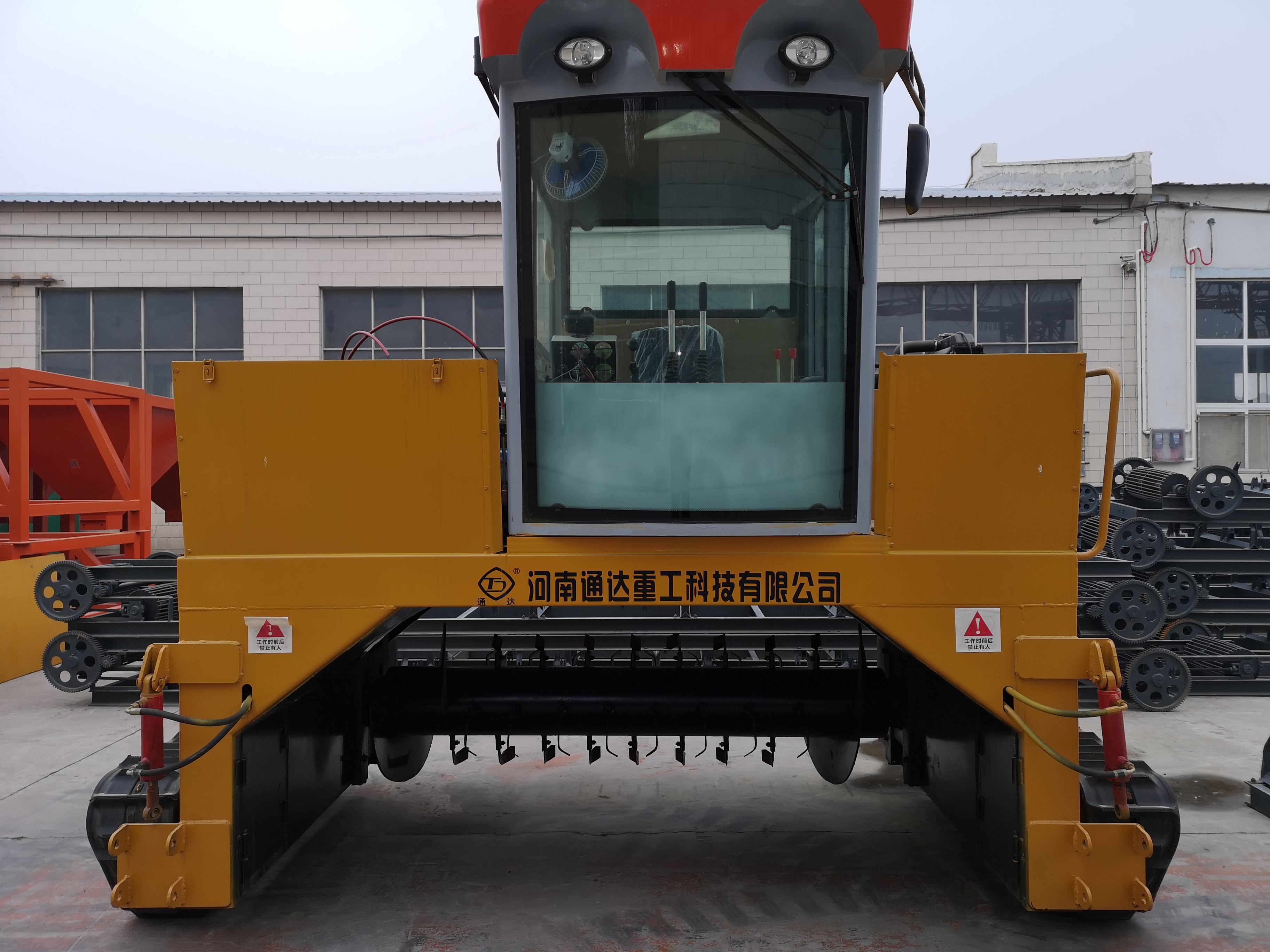 有機肥履帶翻拋機采取四輪行走設計,可前進、倒退、轉彎,由一人操控駕駛。行駛中整車騎跨在予先堆置的長條形肥基上,由機架下掛裝的旋轉刀軸對肥基原料實施翻拌、蓬松、移堆,車過之后篆成新的條形垛堆。該履帶式翻拋機即可在開闊室外露天場地,也可在車間大棚中實施作業。